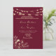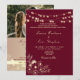 Cette élégante invitation de mariage présente un fond romantique de couleur bourgeon avec des guirlandes lumineuses douces, des accents floraux dorés et une section de réponse correspondante au verso. Un code QR moderne permet aux invités de répondre rapidement et d'accéder à votre site web de mariage. Personnalisée avec votre photo de fiançailles et votre histoire d'amour, cette invitation élégante est parfaite pour les mariages d'automne, d'hiver ou de soirée.