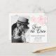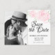 Mettez en valeur la photo de votre couple sur cette carte de faire-part de mariage. Elle est présentée à gauche. Deux élégantes roses aquarelles rose pastel créent une belle bordure au-dessus du texte 'Save the Date' écrit dans une police d'écriture chic et fluide. Vos noms, date et lieu de mariage sont en dessous. Le verso de la carte postale contient plus d'informations sur le mariage. Personnalisez-la comme vous le souhaitez.