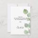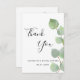Une carte de remerciement pour un mariage. Un fond blanc chic décoré de feuillage d'eucalyptus. Sur le devant, un grand texte manuscrit noir et le texte : Merci, votre et une date.