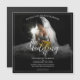 Faire-part de mariage avec une photo d'une mariée rêveuse assise avec un bouquet de fleurs jaunes dans la pénombre - style classique.