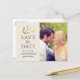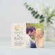Carte de faire-part de mariage avec une photo d'engagement en portrait avec un texte élégant gris foncé / noir doux qui peut être personnalisé au recto et au verso. Une branche de couleur or accentue ce design simple inspiré de la nature. Les couleurs du fond crème / beige et du texte peuvent être modifiées pour coordonner avec votre palette de couleurs de mariage.
