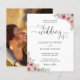 Cette élégante invitation de mariage noir et blanc à petit budget présentant des fleurs rose poudré peut être personnalisée avec les détails de votre célébration dans une typographie chic et votre photo spéciale au verso. Conçu par Thisisnotme©