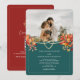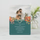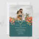 Annoncez votre mariage automnal avec style grâce à ce faire-part photo moderne mettant en vedette un feuillage sarcelle et orange riche, un cœur de corde dorée et un espace pour la photo de votre couple préféré. Le verso comprend un QR code coordonné et les détails de RSVP, alliant l'élégance rustique à la fonctionnalité. Un choix époustouflant pour les mariages d'automne avec un thème boho ou romantique.
