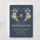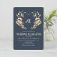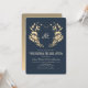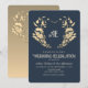 Ce faire-part de mariage élégant en bleu marine et or présente un luxueux design floral baroque avec une couronne florale en forme de cœur et un monogramme classique en haut. Parfait pour les couples qui recherchent une touche sophistiquée et romantique pour leur jour spécial. La combinaison du bleu marine profond et de l'or radieux crée une esthétique intemporelle et royale, ce qui la rend idéale pour les célébrations de mariage formelles et élégantes.
