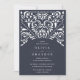 Élégante invitation à un mariage vintage dans riche décor bleu nuit orné qui évoque l'aspect du papier coupé dans un style picado papel.