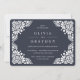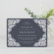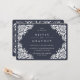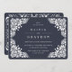 Élégantes invitations de mariage vintage dans une riche couleur bleu minuit avec une bordure déco ornée qui évoque l'aspect de papier découpé dans le style papel picado.