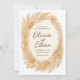 Faire-part de mariage bohème chaleureux avec herbe de pampas, feuilles de palmier séchées et tons terracotta. Cadre floral circulaire avec noms en calligraphie et texte minimal pour un mariage inspiré du désert.