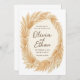 Faire-part de mariage boho chaleureux avec herbe de pampas, feuilles de palmier séchées et tons terracotta. Cadre floral circulaire avec noms en calligraphie et texte minimal pour un mariage inspiré du désert.