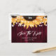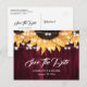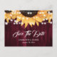 Cartes de faire-part de mariage rustiques bordeaux et tournesol avec des tournesols et des guirlandes lumineuses sur un fond en bois rustique. Articles assortis disponibles.