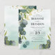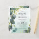 Faire-part de mariage à petit budget avec un fond à lavis aquarelle délavé rustique, feuilles d'eucalyptus botaniques vertes élégantes, éclaboussures de faux foil doré et un modèle de mariage simple facile à personnaliser.