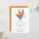 Faire-part de mariage avec un bouquet de feuillage et de fleurs d'automne à l'aquarelle coloré élégant. La couleur de fond, ici un jaune moutarde atténué, peut être personnalisée. Design typographique moderne et chic.