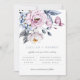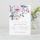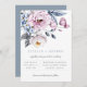 Belle composition florale aquarelle bleu poussiéreux et mauve, faire-part de mariage. Design de typographie gris et bleu moderne et chic. Le dos de la carte présente une couleur unie en bleu poussiéreux, qui peut être personnalisée.