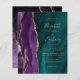 Cette élégante invitation de mariage moderne présente un design d'agate aquarelle violet et sarcelle orné de paillettes d'or fausses. Le texte personnalisable combine une écriture dorée, un copperplate et des polices italiques. Le verso présente un design d'agate violet et or coordonné.