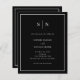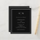 Ces invitations de mariage tout-en-un élégantes, modernes et économiques sont imprimées sur une feuille de papier. Elles présentent un design de texte minimaliste blanc simple sur un arrière - plan noir foncé, avec un cadre classique à la bordure. Ajoutez vos initiales ou votre monogramme pour les rendre complètement vôtres. Le verso de l'invitation permet d'ajouter des détails sur les invités, ainsi qu'un code QR scannable pour que les invités puissent RSVP en ligne sur votre site mariage.