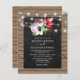 Invitations de mariages campagnards rustiques budget avec une toile de fond en bois clair, un centre en damier noir, des fleurs d'aquarelle audacieuses, des lumières à corde et un élégant modèle de mariage facile à personnaliser.