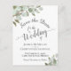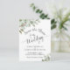 Ces jolies cartes de faire-part de mariage présentent un design aquarelle peint à la main avec des feuilles d'eucalyptus, de la verdure et du feuillage dans des nuances de vert sauge. La lettre élégante est une calligraphie scriptée qui donne à la carte un style bohème chic sophistiqué. Le dos comporte un graphique "pencil us in" ainsi que de la place pour un site web et d'autres informations.