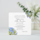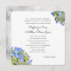 Invitations de mariage floral bleu clair. Cartes carrés modernes avec de jolies hydrangées bleues dans les coins et un design floral blanc à l'envers. Texte imprimé en noir avec modèle en haut pour les parents de la mariée, qui invitent les invités. Ajoutez également les parents du marié avec la ligne "fils de". *Laissez un espace entre les lignes de texte imprimées pour répliquer cet aspect.