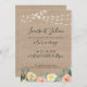 Faire part de mariage champêtre et vintage, inspiration guinguette. Avec guirlandes lumineuses, fleurs et fond bois.