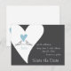 La conception du produit présente deux colombes blanches perchées ensemble et regardant vers un cœur bleu clair. Les colombes blanches sont des symboles d'amour, de chance, de paix et de prospérité. Cette illustration simple de petits oiseaux mignons donne des cartes de faire-part de mariage modernes et uniques.