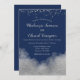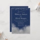 Un élégant faire-part de mariage bleu marine et argent avec de la poussière de confettis argentée en haut et un accent argenté en bas.
