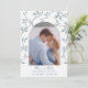 Carte de faire-part de mariage avec Toile bleue et blanche délicate avec des oiseaux et des fleurs entourant un cadre en arche avec photo de couple