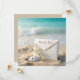 Une enveloppe blanche est ornée d'un brin de souffle de bébé et repose sur un terrain de plage sablonneux, accompagnée d'un dollar de sable et d'une étoile de mer.