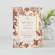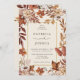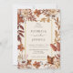 Cette élégante faire-part de mariage d'automne recouverte de deux côtés présente des fleurs d'aquarelles d'orange et de terre cuite brûlées, des roses de jardin boho et des dahlias bordeaux de marron. Doté d'une calligraphie rustique manuscrite, de détails RSVP et d'un code QR, il est parfait pour les mariages de automne d'extérieur du jardin bohème.