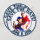 Cartes "Save the date" rondes sur le thème du mariage et du baseball. Celle-ci est personnalisée pour un client spécifique. Le recto de la carte est un encart/ cadre photo. Anneaux intérieurs et extérieurs bleus avec une photo personnalisée au centre. Des cercles de texte en verre décoratif bleu autour du haut et indiquent : SAVE THE DATE. Davantage de cercles de texte en verre autour du bas et indiquent la date du mariage des clients. Ce texte est présent des deux côtés de la carte. Le fond de la bordure extérieure est constitué de rayures de baseball bleues et blanches. Au verso de la carte, on retrouve le même texte en haut et en bas sur un fond rayé. De petits embellissements en forme de cœur rouge sont placés entre les mots. Le fond central est blanc uni avec des balles de baseball dispersées partout. Le texte décoratif en verre indique : Mathew Howard et Sylvia Newcomb montent sur le marbre et parient à 1000 contre 1 que leur amour durera éternellement. Les équipes fusionneront en une seule le 11 juin 2016. Les