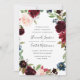 Notre faire-part de mariage Radiant Bloom entoure vos détails du jour de mariage avec un cadre de fleurs d'aquarelle en marsala bordeaux, rose et bleu marine, avec feuillage botanique vert et feuilles d'eucalyptus sur un riche arrière - plan bleu marine. Un beau choix de couleurs luxuriantes et saturées pour les mariages d'automne ou d'hiver.