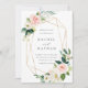 La Faire-part de mariage en fleurs blanches est ornée de fleurs d'aquarelle peintes dans un feuillage rose, blanc et vert avec un cadre géométrique doré. Pour une personnalisation plus avancée de cette conception, veuillez cliquer sur le bouton "Personnaliser". Des articles correspondants sont également disponibles.