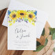 Nos faire-part de mariage Flowerfields encadrent vos détails mariages avec une bordure supérieure de tournesol jaune aquarelle, bourgeons bleus et violets, et feuillage vert.