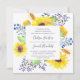 Nos Flowerfields faire-part de mariage dans un format carré unique encadre vos détails mariages avec des tournesols couleur jaune, des feuilles verts luxuriants, des bourgeons violets et bleus. Un beau choix pour l'été rustique ou les mariages de automne dans un cadre champêtre ou extérieur.