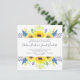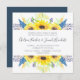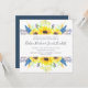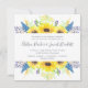 Nos Flowerfields faire-part de mariage dans un format carré unique encadre vos détails mariages avec une bordure supérieure et inférieure de tournesols couleur jaune ensoleillé, bourgeons violets et bleus, et feuillage vert luxuriant.