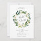 Des invitations à mariage florales élégantes sont accompagnées d'une couronne de roses blanches d'aquarelle et de pivoines au feuillage botanique vert luxuriant et de feuilles, encerclant vos noms dans des lettres manuscrites chic. Personnalisez avec vos détails mariages sous.