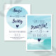 "Quelque chose de beau est à l'horizon", une citation à l'arrière de l'invitation est une agréable touche pour présenter votre jour de mariage à vos invités. Un océan bleu, thème d'été pour un mariage sur la plage. Message pour tous les autres éléments que vous souhaitez faire correspondre à ce thème.