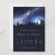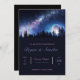Belle Faire-part de mariage aux couleurs bleu et violet qui montre une forêt foncée, une pleine lune et un ciel plein d'étoiles.