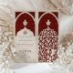 Plongez dans la profondeur de la magnificence culturelle avec ce faire-part de mariage de dentelle islamique rouge royal. L'avant et l'arrière de l'invitation sont ornés d'un motif en dentelle orné qui présente de riches teintes de rouge, allant de la cicatrice vibrante au marron profond, complété par un accent crème élégant qui ajoute une touche de sophistication. Le design s'inspire de motifs islamiques traditionnels, avec des motifs flornés et géométriques qui ressemblent à l'intérieur opulent des palais et des mosquées. Cette invitation est imprimée pour imiter une texture gaufrée, donnant le sens du luxe et de l'artisanat raffiné qui est parfait pour un mariage qui célèbre à la fois l'amour et le patrimoine.