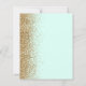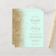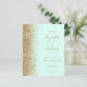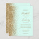 Le bord gauche de cette élégante faire-part de mariage moderne est orné d'une bordure de parties scintillant en faux or. Le texte personnalisable associe écriture manuscrite dorée, cuivre et polices italiques sur un arrière - plan vert menthe pastel. L'envers est assorti d'une parties scintillant vert menthe et or.
