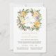 Ce joli faire-part de mariage est parfait pour les mariages de fin d'été ou d'automne, mais aussi pour les événements d'été. Il dispose d'une belle couronne circulaire fleurie en haut, avec les initiales de la mariée et du marié au centre. Les couleurs incluses dans la couronne sont l'or, l'orange mandarine, le jaune citron et le vert, ainsi que des touches de violet et de rouge. Magnifique ! Sous la couronne se trouve votre texte personnalisé en or et or gris. L'image et le texte sont placés sur un élégant arrière - plan blanc. L'arrière de l'invitation est un or antique doux pour contrebalancer le front blanc.