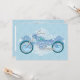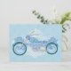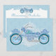 Une moto dans les tons bleu et violet avec des courbes et des tourbillons doux se dresse contre un treillis blanc sur un arrière - plan floral bleu remplissant ce faire-part de mariage motard de romance. D'après mon image originale numériquement.