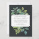 faire-part de mariage botanique vintage affiche vos détails mariages dans du lettrage noir foncé moderne, sur un arrière - plan de feuilles d'aquarelle vert peint, branches et fougères. Un arrière - plan riche et sombre ajoute du théâtre et de l'élégance.