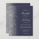 Le bord gauche de cette élégante faire-part de mariage moderne est orné d'une bordure en faux parties scintillant argenté. Le texte personnalisable combine écriture gris argenté pâle, copperplate et polices italiques sur un arrière - plan bleu foncé. L'envers est assorti d'un design bleu foncé et argenté.