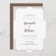 Célébrez votre mariage avec une élégance intemporelle en utilisant ce Faire-part de mariage de script simple et élégant. Conçue avec un cadre à angle classique et une police de calligraphie élégante, cette invitation minimaliste donne le ton d'une cérémonie chic et raffinée. Parfait pour les mariages, les événements d'inspiration vintage ou les couples qui apprécient la beauté sous-jacente. Entièrement personnalisable avec les détails de votre événement. Imprimé sur du papier de qualité supérieure afin d'assurer une belle impression.