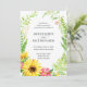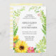 Faire-part de mariage de tournesol aux fleurs jaunes et roses et feuilles verts sur un arrière - plan blanc.Les fleurs encadrent le libellé de l'invitation. L'arrière de l'invitation a un arrière - plan rayé jaune pâle.