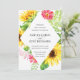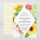 Faire-part de mariage de tournesol en jaune et des touches de fleurs roses et de feuilles verts.Le cadre fleuri est en forme de losange avec les détails de l'invitation à l'intérieur. Le fond de l'invitation est décoré de rayures d'aquarelle jaune pâle. L'arrière - plan de la carte est blanc, mais vous pouvez sélectionner une teinte dans le sélecteur de couleurs.