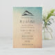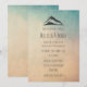 Un faire-part de mariage simple et minimaliste. Conçu dans un style rustique et extérieur. En haut, une illustration d'une montagne avec des rayons de soleil émanant de derrière. Le fond est de couleur parchemin avec une pointe de bleu.