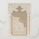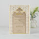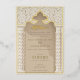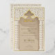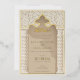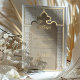 Cette invitation est un énoncé luxueux, parfait pour les couples qui cherchent à mélanger le design islamique traditionnel avec l'élégance moderne. Ses touches dorées éclairent le motif en dentelle complexe, créant un contraste saisissant avec l'arrière - plan taupe et beige. Les éléments architecturaux rappellent la grandeur de l'entrée d'une mosquée, avec des colonnes à motifs de chevrons encadrant la carte et une arche magnifiquement stylisée couronnant le texte. L'utilisation de teintes crème, écru et or dégage de l'opulence, tandis que les détails fins de l'oeuvre reflètent un profond respect pour l'art culturel. Cette invitation promet une célébration où beauté intemporelle et style contemporain convergent pour créer une expérience inoubliable.