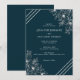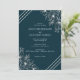 Invitation de mariage avec des lis blancs simples et beaux dessinés à la main et des lignes blanches diagonales sur fond bleu foncé. Les lis et les lignes sont situés dans les coins supérieur et inférieur