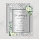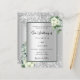 Faux arrière - plan de couleur argent décoré de fleurs blanches, de fleurs, de verdure d'eucalyptus et de parties scintillant faux argent, scintille. Personnalisez et ajoutez vos noms et les détails du mariage. Lettres noires.