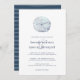 La faire-part de mariage côtière chic présente en haut une illustration couleur sable bleu pâle, avec vos détails mariages en dessous en bleu marine classique. Parfaits pour les mariages de plage, d'été ou nautiques, ces invitations de mariage de style côtier renversent pour tonifier sur des bandes ondulées en bleu port.